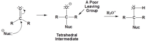 - Nucleophile forms a covalent bond to the carbon which break the pi bond associated with carbonyl.