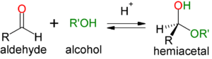 - Hemiacetal: when one equivalent of alcohol (acts as the nucleophile) is added to an aldehyde