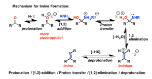 - Imine: simplest case. Ammonia adds to a carbon atom and water is lost