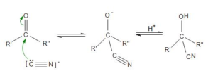 - Reaction with aldehydes and ketones produces stable compounds called cyanohydrins